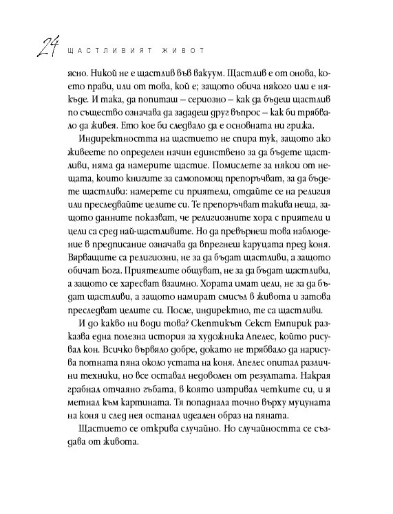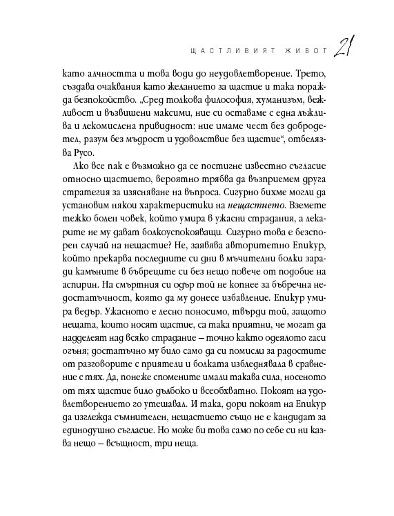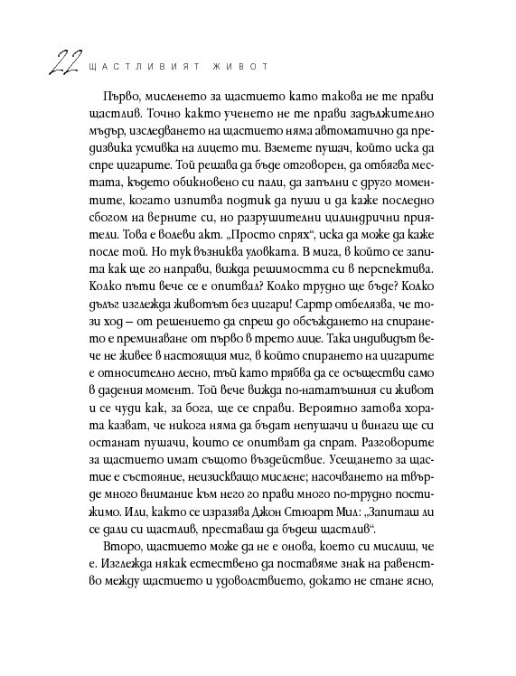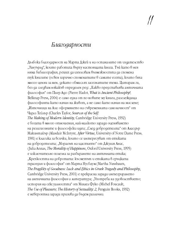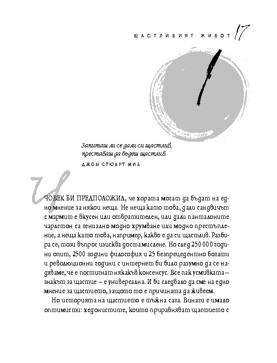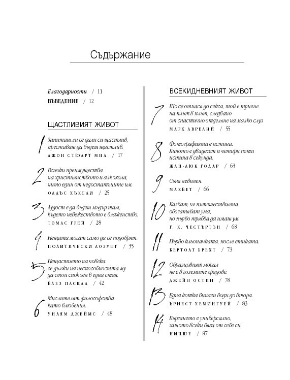 Четиридесет и две мъдри мисли, свързани с най-важните житейски въпроси. Цитирайки казаното от велики умове в човешката история, от Сократ до Монти Пайтън, Върнън търси отговори в сферата на професионалната изява, любовта, вечния живот, секса и щастието. Чрез афоризми, аналогии и анекдоти авторът ни дава възможност да открием приложението на философията в задачата да живеем пълноценно.