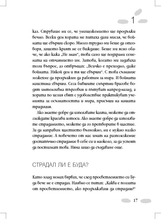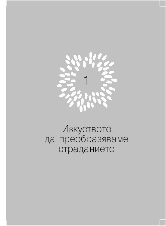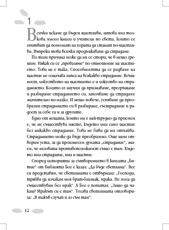 Едно от нещата, които ни е най-трудно да приемем е, че не съществува място, където има само щастие без никакво страдание. Това не бива да ни отчайва. Страданието може да бъде преобразено. Не бива да забравяме, че още щом отворим уста, за да произнесем думата „страдание“, неговата противоположност също е там. Където има страдание, има и щастие.