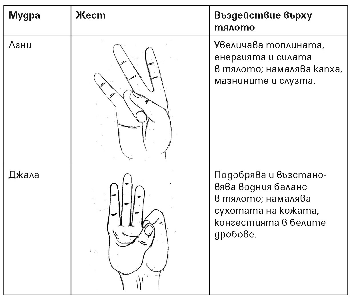 Както вече споменахме, ние сме съставени от пет елемента и всеки пръст на ръката съответства на един от тях. Палецът съответства на огъня (агни), показалецът – на въздуха (ваю), средният пръст – на етера (акаш), безименният пръст – на земята (притхви), а кутрето – на водата (джала). Тъй като всички болести в крайна сметка се дължат на дисбаланс, предизвикан от липсата или излишъка на някой от тези елементи, то ако равновесието на аюрведичната конституция бъде възстановен, тялото ще може да се излекува. Пръстите ни – като средство за лечение – канализират протичането на прана, намиращи се в тези крайни точки на тялото. Щом насочим вниманието си навътре, можем да постигнем баланс.