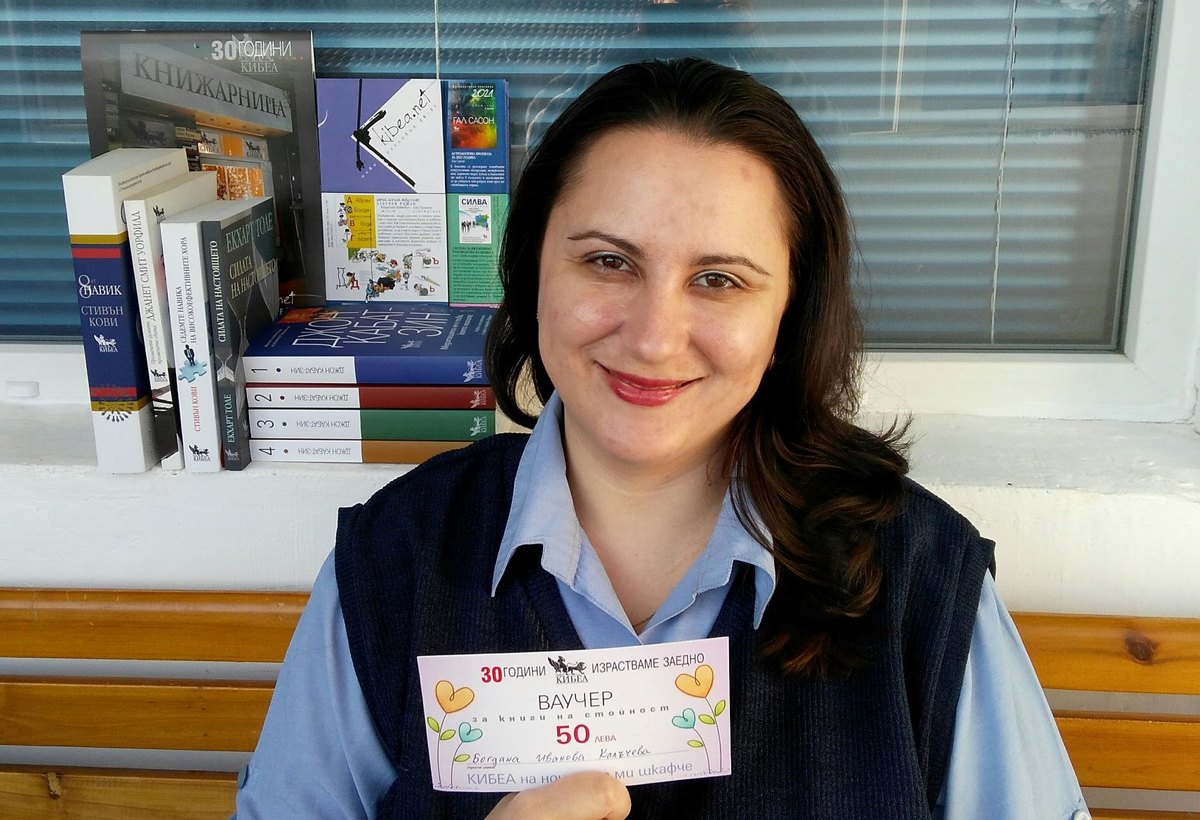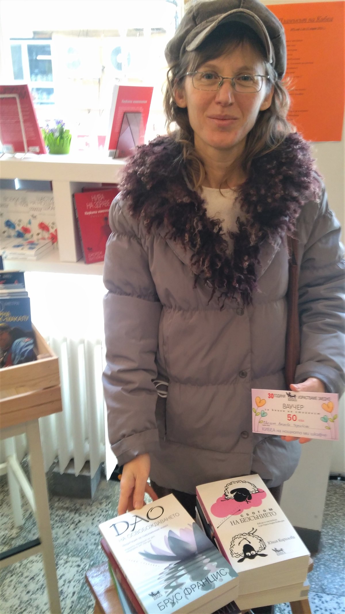Купувала съм си определено избрано заглавие, купувала съм и с подбран списък от заглавия, както и имам друг списък със заглавия на книги, които предстои да си купя. Купувала съм и онлайн, когато бяхме затворени месец през март 2020 г., но най-голямо е удоволствието да мина през фирмената ви книжарничка в гр. София на ул.„Хан Крум“ №15 и да се срещна с Валентина Митанкина, от която винаги има какво да научиш и която винаги знае какво да препоръча на клиентите си. Да не забравя и великолепните книги, които съм получила като подаръци по различни поводи от издателството. Благодаря, Кибеа!