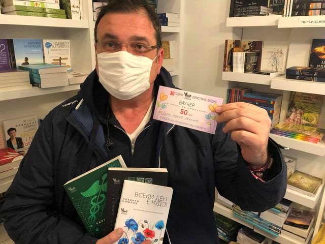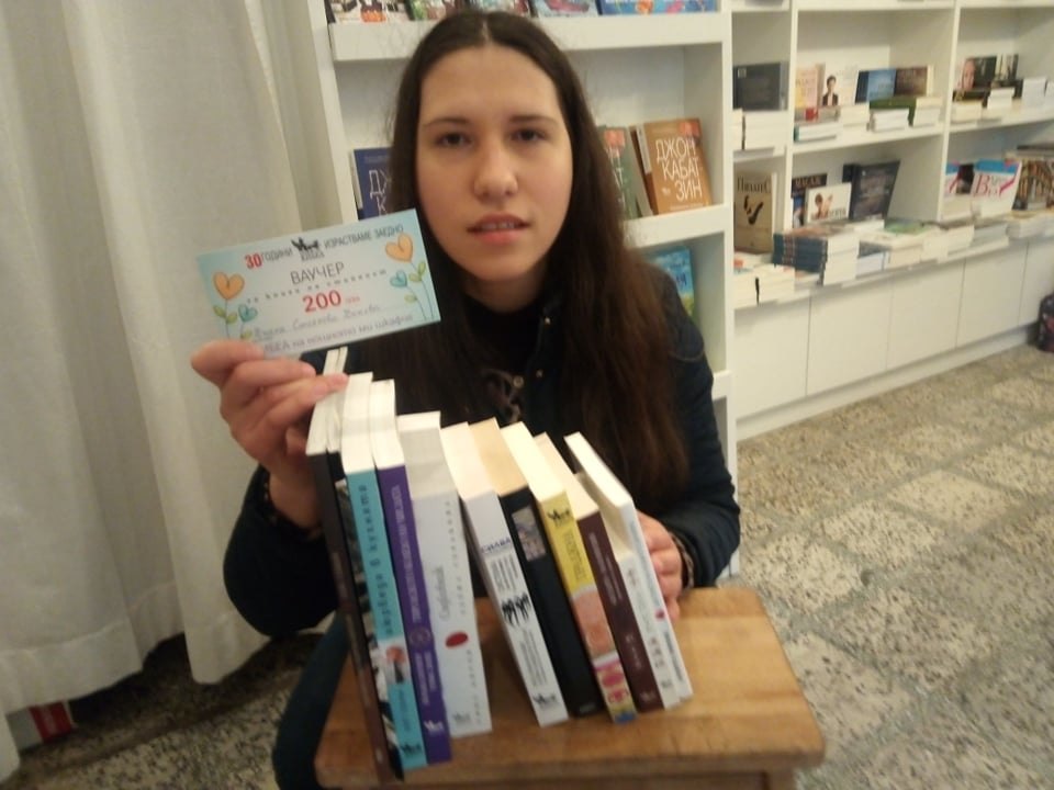 На снимките долу: Диана Димова с ваучера за 200 лв. и избраните книги. Следват Орлин Евтимов (ваучер за 50 лв.), Мариела Стефанова (с маската) – „Избор на редакцията“, Богдана Калъчева с награда за видео и Светлана Терзийска (ваучер за 50 лв.)
