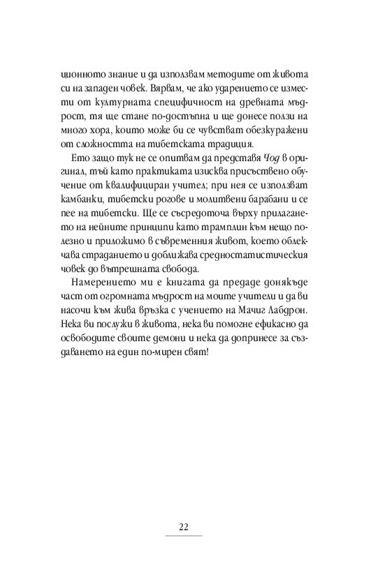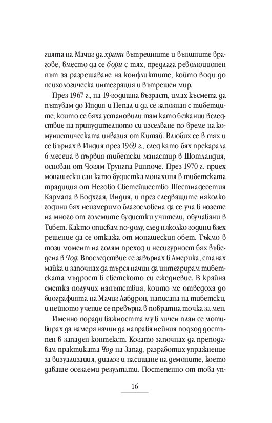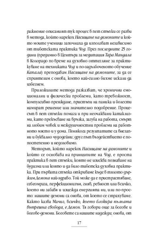Техниката е проста: визуализирайки ги в конкретна форма и предлагайки им това, от което имат нужда, се освобождаваме от тях. На практика се сприятеляваме с това, което най-много ни плаши. Стратегията е любов, грижа и разбиране, а не бягство или борба с враговете. Петте стъпки на практиката ни превеждат през целия процес на трансформиране на Звяра в Съюзник, а енергията, въвлечена във вътрешния конфликт, се освобождава и се превръща в неоценим ресурс и потенциал за лично израстване.