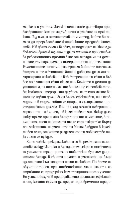 Вярвам, че подходът „да въвлечем врага в играта“ и да го „наситим“ представлява революционно преминаване от парадигма на доминиране към парадигма на толерантност и интеграция. Религиозните системи, разчертали бойните полета за вътрешните и външните битки, доведоха до силно поляризирани изживявания във вътрешния ни свят и във все по-плашещия свят около нас. Колкото и демони да унищожим, на тяхно място винаги ще се появяват нови; колкото и терористи да убием, на тяхно място винаги ще идват други. За да бъдем ефективни, ни е необходим нов модел, който се опира на състрадание, присъединяване и диалог. Този подход загатва невероятни хоризонти – и в личен, и в колективен план.
