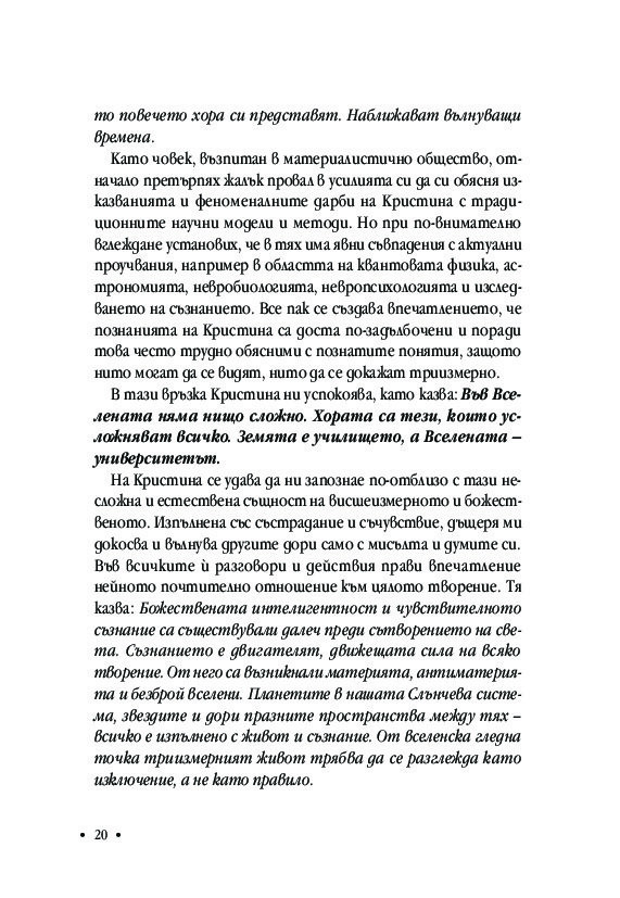Тази първа книга от поредицата за необикновеното момиче Кристина фон Драйен разказва – през погледа на майка ѝ Бернадет – историята на необикновеното раждане, детство и юношество на Кристина до 16-годишната ѝ възраст. Майката с почуда установява необикновените парапсихични способности на своето крехко дете и се опитва да ги проумее и приеме, търсейки научни потвърждения и обяснения на чутото. Момичето се учи да овладява и обяснява с представите от триизмерната ни реалност своите невероятни способности, съзнавайки, че всичко, през които минава, е подготовка за мисията ѝ в този живот.