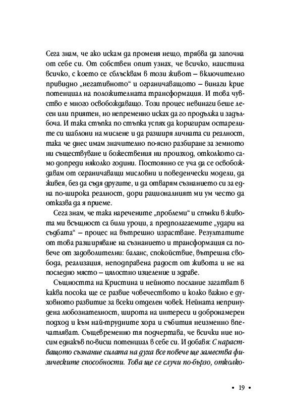 Кристина притежава забележителен поглед върху днешните световни дела и удивлява с високата си етика, както и с мъдростта и вътрешния покой, чрез които загатва за предстоящата еволюция в човешкото развитие. Като предвестник на нов етап в човешката еволюция Кристина (и близначката ѝ Елена) са се въплътили на Земята, за да разпространяват светлина и мир.