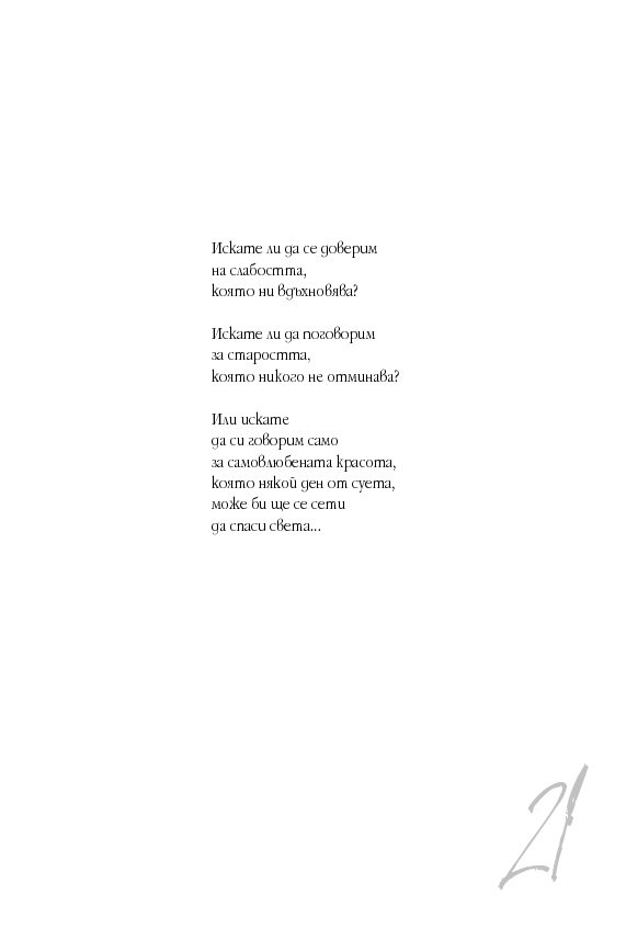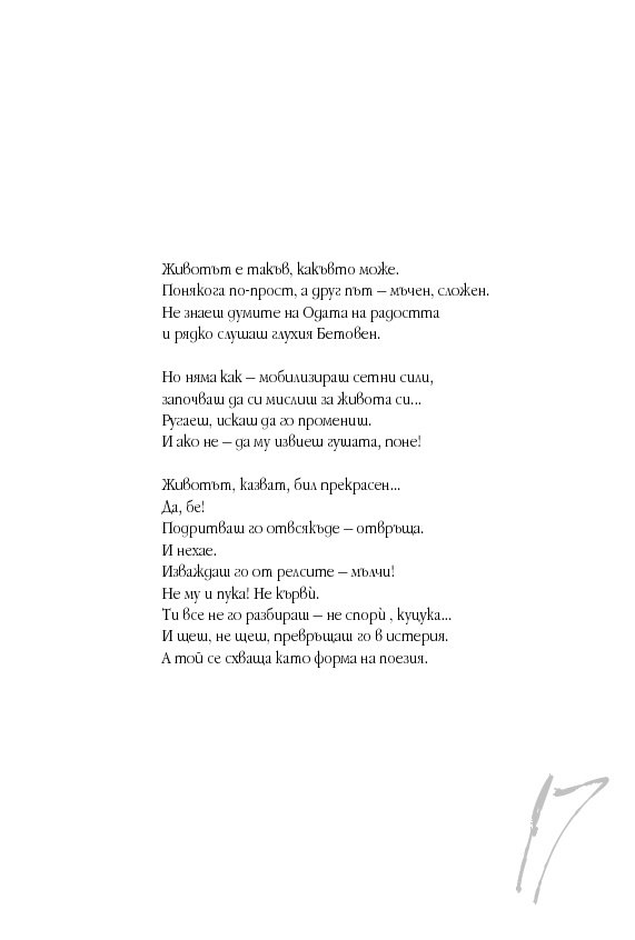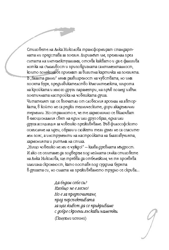 Стиховете на Анка Николова трансформират стандартната ни представа за поезия. Лиризмът им, преминал през ситата на интелектуализма, отсява каквато и да е фалшива нотка на сълзливост и приповдигната сантименталност, които понякога се приемат за визитна картичка на поезията.