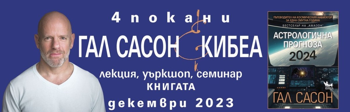 ПЪРВА СРЕЩА НА ЖИВО с дългоочакваната книга на Гал Сасон „Астрологична прогноза 2024. Пътеводител на космическия навигатор за една смутна година“ – на кибейския щанд 336. Ще можете да вземете автограф от автора на лекцията му в петък (8 декември) или в събота (9 декември) по време на уъркшопа и семинара. Естествено и на щанд 336 след краткото представяне на книгата на Сцената на културната програма (виж по-долу).