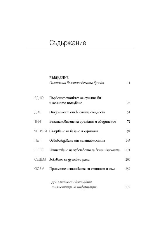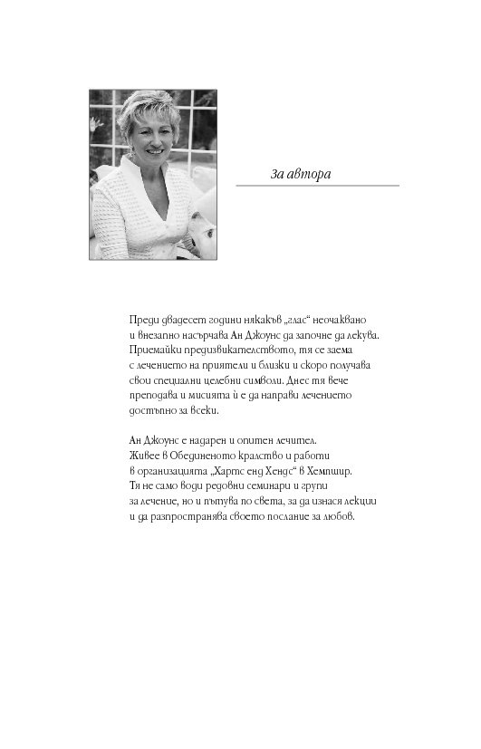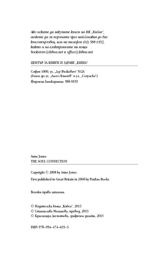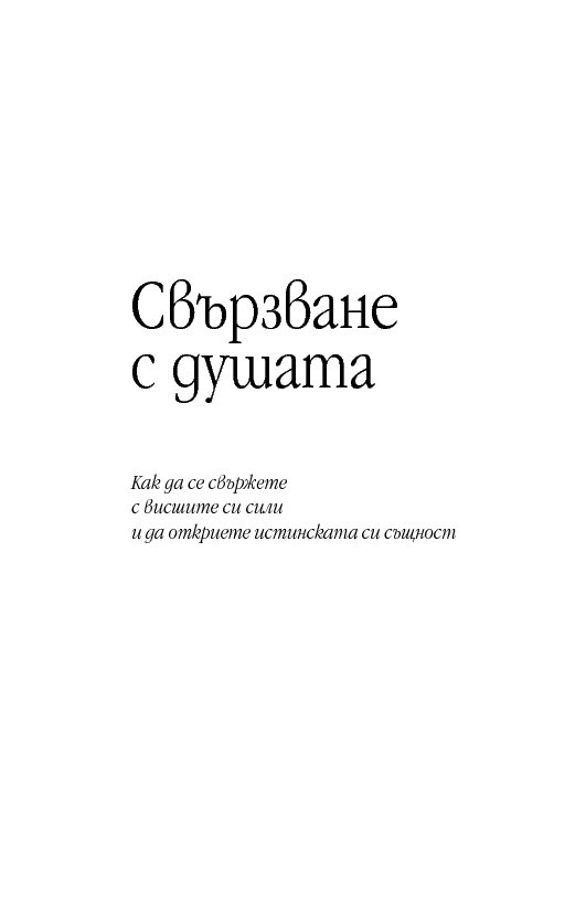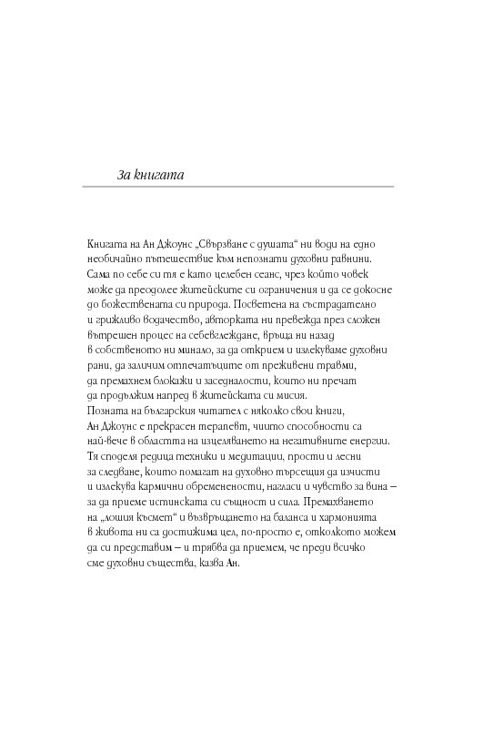 „Свързване с душата“ е и необичайно пътешествие и целебен сеанс, за да се преодолеят житейските ограничения и да се докоснем до божествената си природа. Посветена на състрадателно и грижливо водачество, авторката ни превежда през сложен вътрешен процес на себевглеждане, връща ни назад в собственото ни минало, за да открием и излекуваме духовни рани, да заличим отпечатъците от преживени травми, да премахнем блокажи и заседналости, които ни пречат да продължим напред в житейската си мисия. Ан Джоунс е прекрасен терапевт, чиито способности са най-вече в областта на изцеляването на негативните енергии. Тя споделя редица техники и медитации, прости и лесни за следване, които помагат на духовно търсещия да изчисти и излекува кармични обременености, нагласи и чувство за вина – за да приеме истинската си същност и сила. Премахването на „лошия късмет“ и възвръщането на баланса и хармонията в живота ни са достижима цел, по-просто е, отколкото можем да си представим – и трябва да приемем, че преди всичко сме духовни същества, казва Ан.