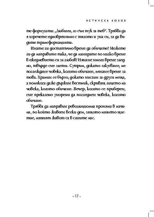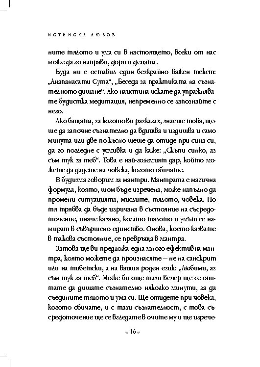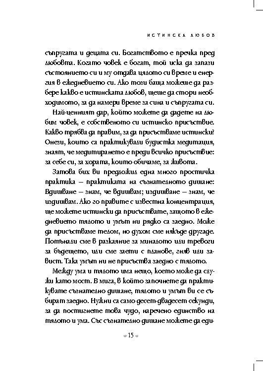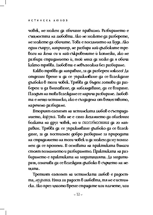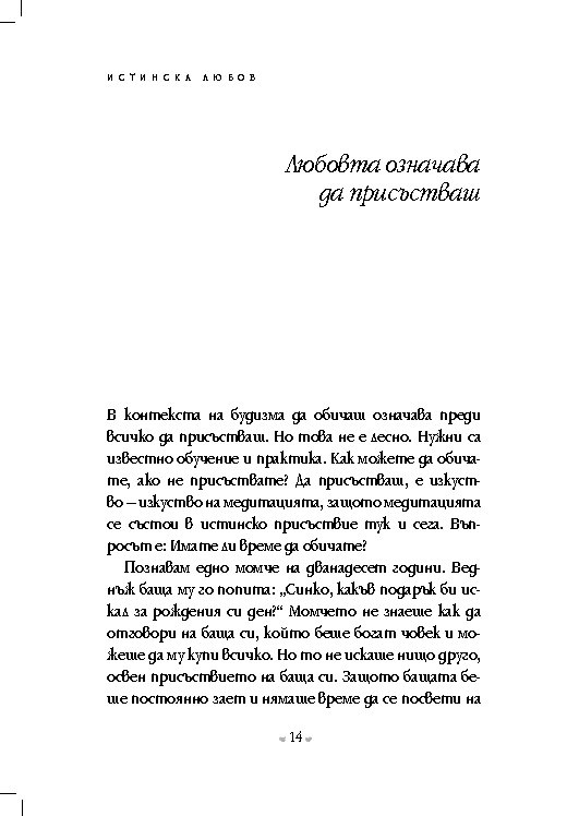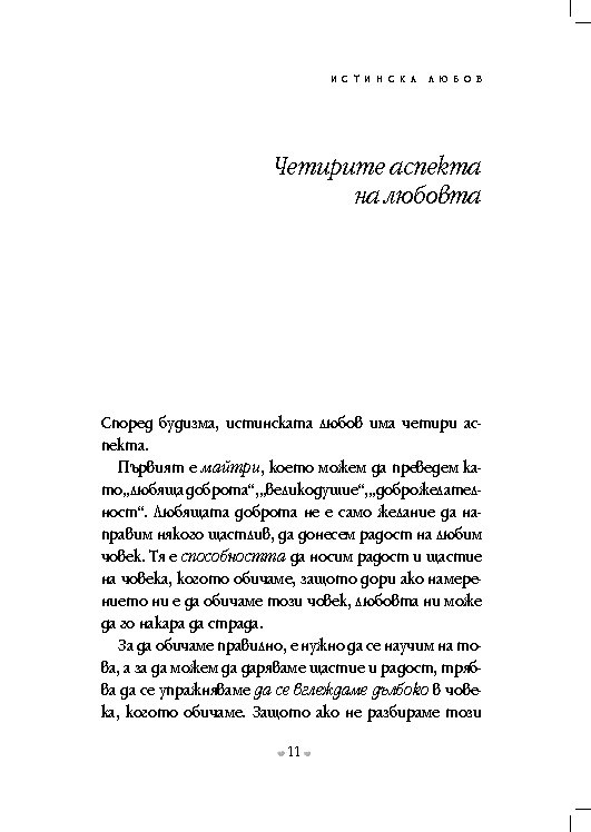 Простичко, топло и откровено той ни представя четирите основни аспекта на любовта, описани в будистката традиция: любяща доброта, състрадание, радост и свобода, и ни показва как да ги преживяваме всеки ден от живота си. Книгата ни насочва как да обичаме истински, като първо се научим да присъстваме в живота си, а впоследствие ни разкрива прости техники от будистката традиция, които всеки може да използва, за да създаде условията, необходими за любовта.