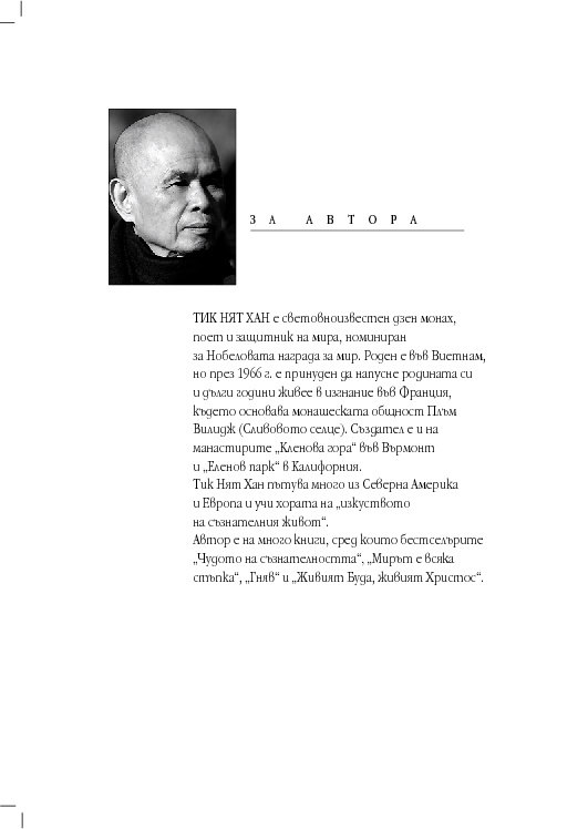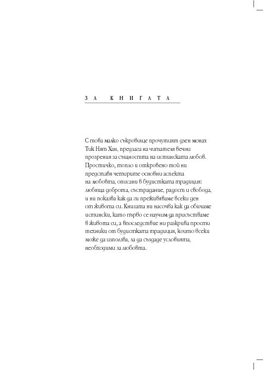 С това малко съкровище прочутият дзен монах Тик Нят Хан предлага на читателя вечни прозрения за същността на истинската любов.