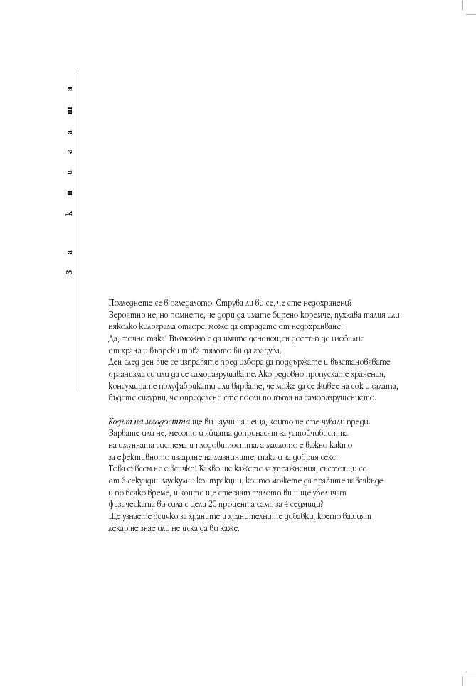 „Кодът на младостта“ ще ви научи на неща, които не сте чували преди. Вярвате или не, месото и яйцата допринасят за устойчивостта на имунната система и плодовитостта, а маслото е важно както за ефективното изгаряне на мазнините, така и за добрия секс.