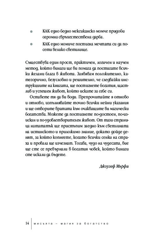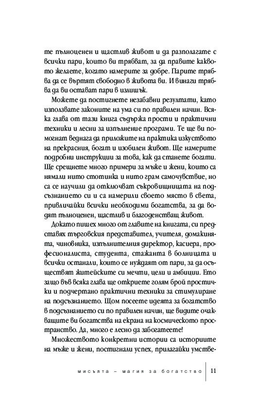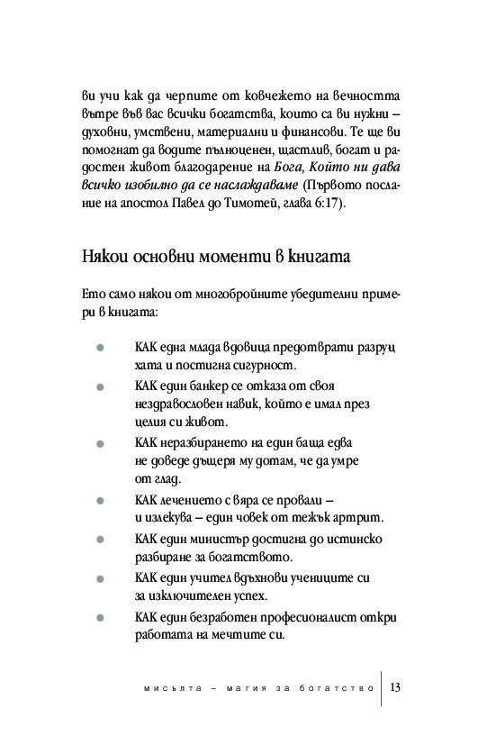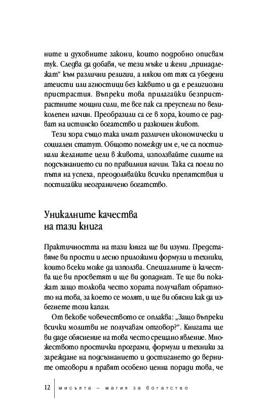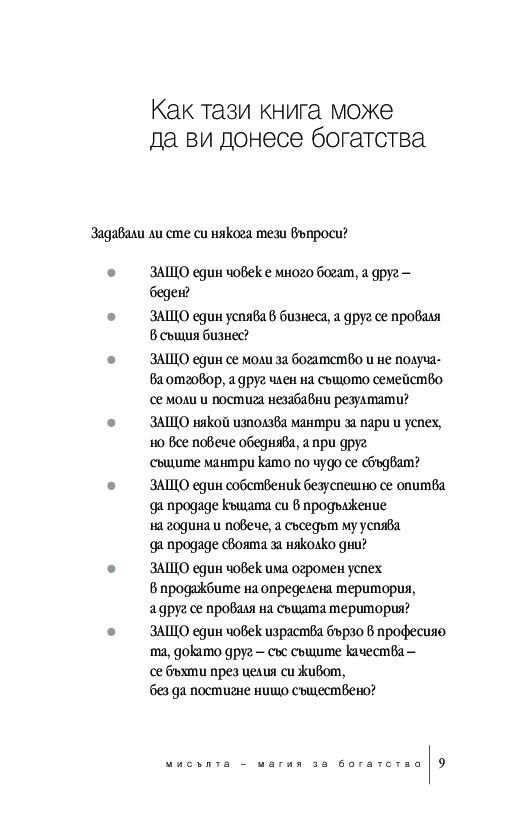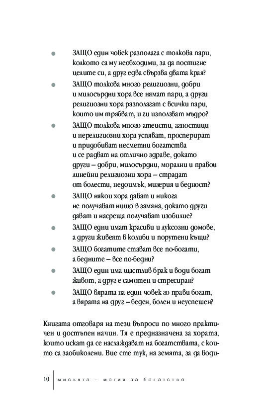 Мисълта – магия за богатство е напълно актуализиран текст, който отразява динамичните промени на XXI век. Това преработено издание за класическата самопомощ е ключът към преодоляването на психологическите бариери, които пречат за по-голямо материално, духовно и емоционално богатство.