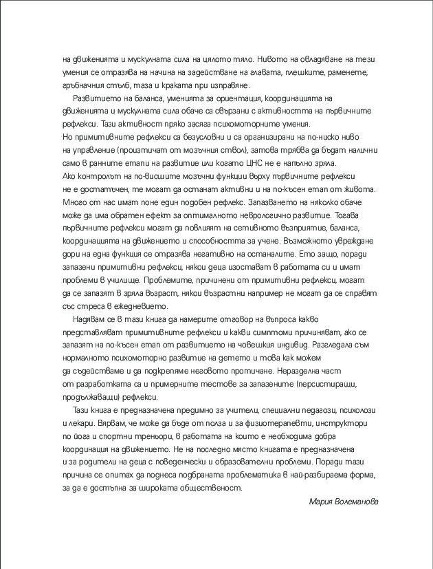 Уникалната публикация за запазените (персистиращи, продължаващи) рефлекси е предназначена за широк кръг читатели и особено за онези, които се стремят да разрешат причината за лавинообразните проблеми в обучението и поведението на днешните деца.