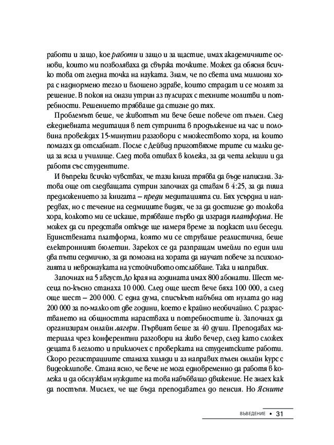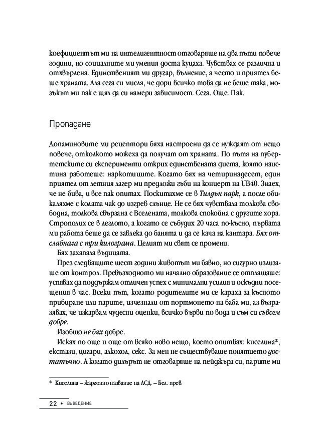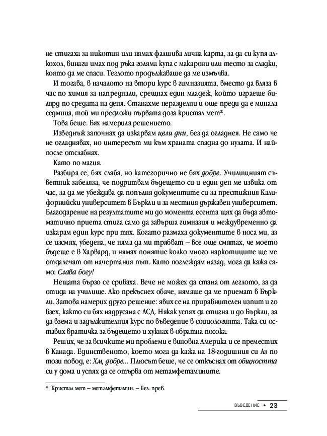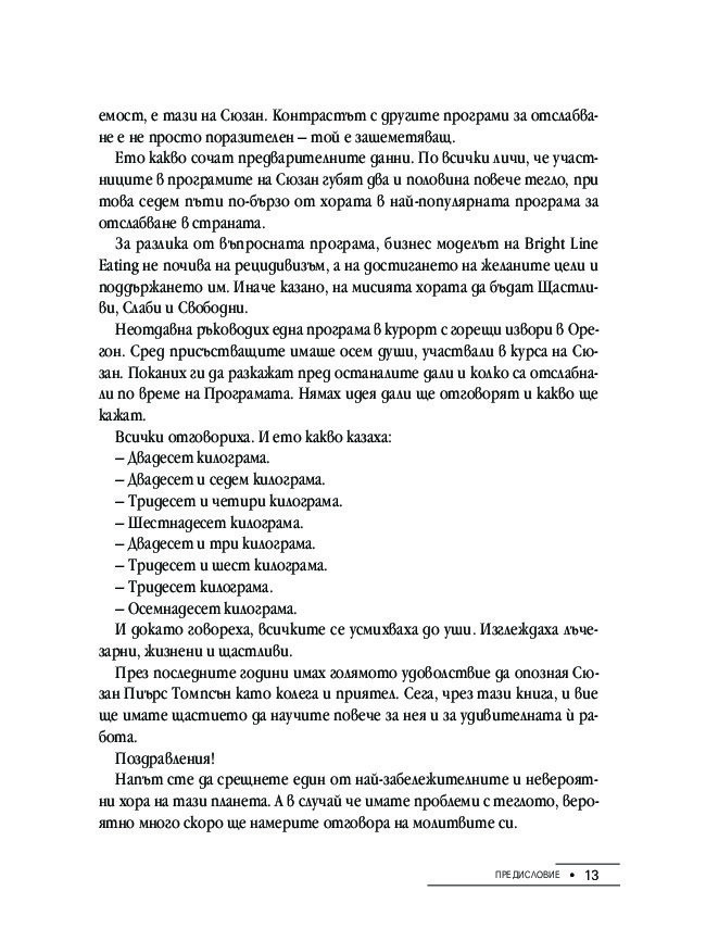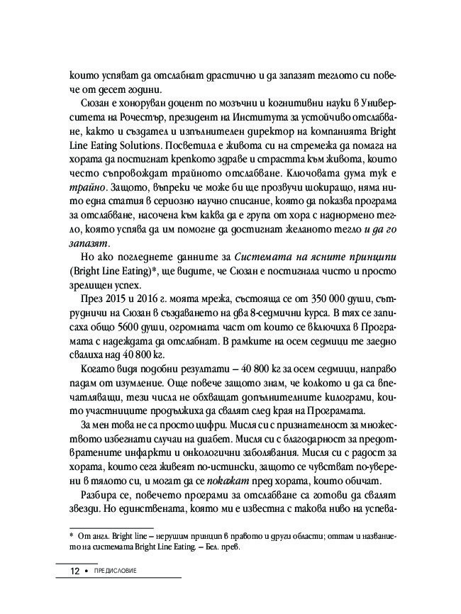 Системата на ясните принципи (Bright Line Eating) е прост подход, целящ да преобърне този процес. Чрез поставянето на ясни и недвусмислени, ненарушими граници Сюзан Пиърс Томпсън ни показва как можем да изцелим мозъка си и да го вкараме в режим, в който да бъде готов да се освободи от ненужните килограми, да се избави от лакомията и да спре да саботира целите ни в отслабването.