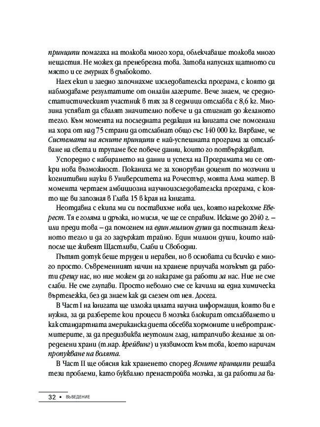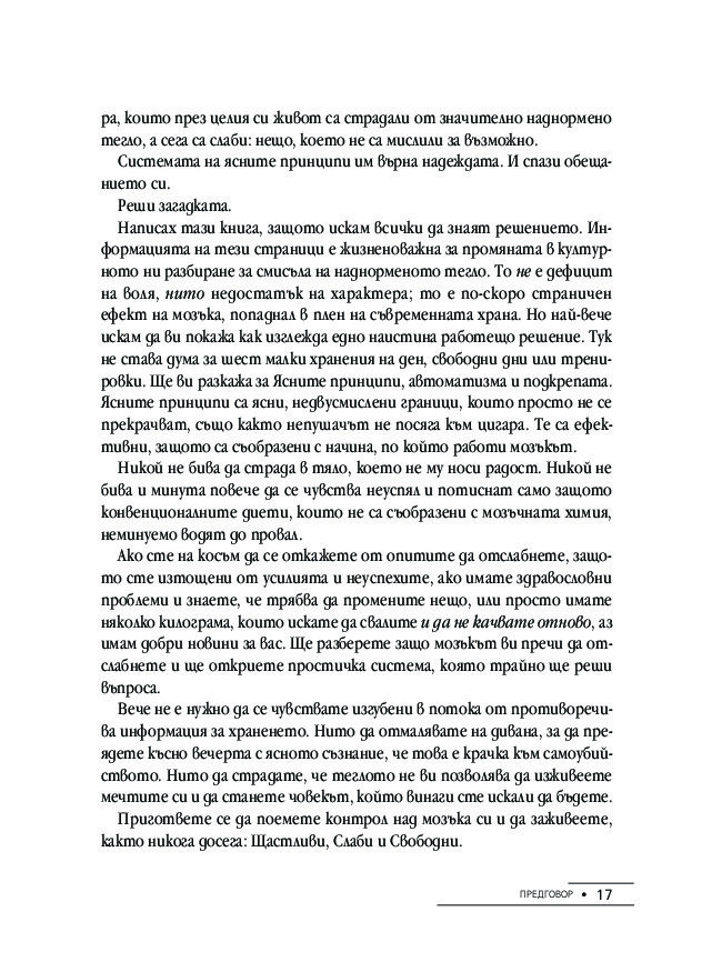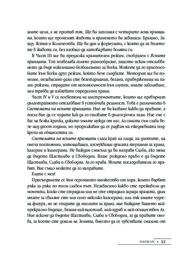 Системата на ясните принципи слага край на глада, на диетите, на този непрестанен, изтощителен, изпиващ душата цикъл в главата, който все брои калории и килограми... Бъдете Щастливи, Слаби и Свободни: това е ваше рождено право.
