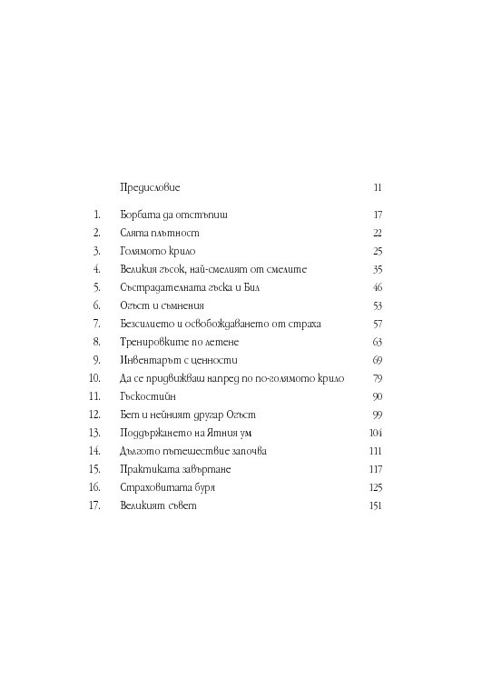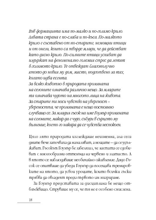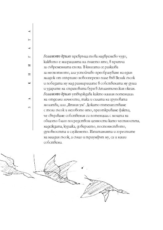 Голямото крило утвърждава както нашия потенциал на отделни личности, така и силата на груповата молитва, или „Ятния ум“. Докато пътешестваме с този гъсок и неговото ято, преоткриваме факта, че свързваме собствения си потенциал с мощта на общото благо посредством ценности като честността, надеждата, куража, доверието, постоянството, духовността и служенето. Изпитанията и горестите на младия гъсок, а също и триумфът му, са и наши собствени.