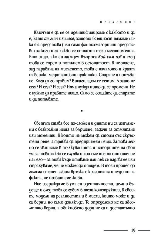 Подробните насоки и инструкции за практикуване на различни техники за медитация: в легнало, седнало и ходещо положение, както и способи от хатха йога, отварят вратите за осъзнаването на момента извън времето и препускащия делник – тук и сега. Ще научите кои са често срещаните препятствия пред практиката за осъзнатост и как да ги преодолявате