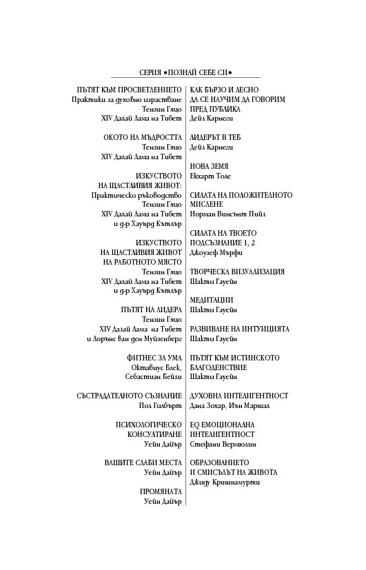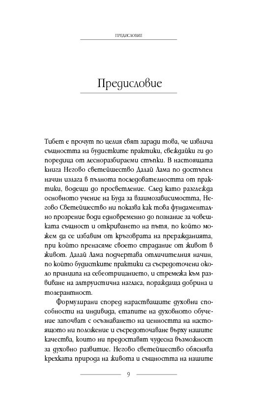 Позовавайки се на традиционните будистки медитативни практики и на примери от днешния изпълнен с проблеми свят, той ни предлага упражнения, които да подпомогнат духовното ни развитие. Следвайки духовните практики, очертани в книгата, можем да се научим как да заменим негативните чувства с положителни нагласи и да поемем по пътя, водещ към по-извисено състояние – и вътре в себе си, и в големия свят.