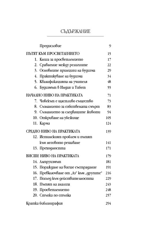 В книгата си „Пътят към просветлението“ Негово светейшество Далай Лама прави задълбочено изследване на основите на будизма, предоставяйки на читателите достъпен и практически подход към вековните въпроси: Как да се освободим от страданието? Как да постигнем трайно щастие и покой?