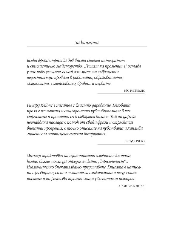 Култовият роман на Ричард Йейтс има какво да каже на съвременността, тъй като открито изрича често потулвани истини за човешката същност. През 2008 г. носителят на Оскар Сам Мендес, въодушевен от „Пътят на промените“, създава поразяващия с драматизма си едноименен филм, в който Кейт Уинслет и Леонардо ди Каприо изпълняват главните роли.