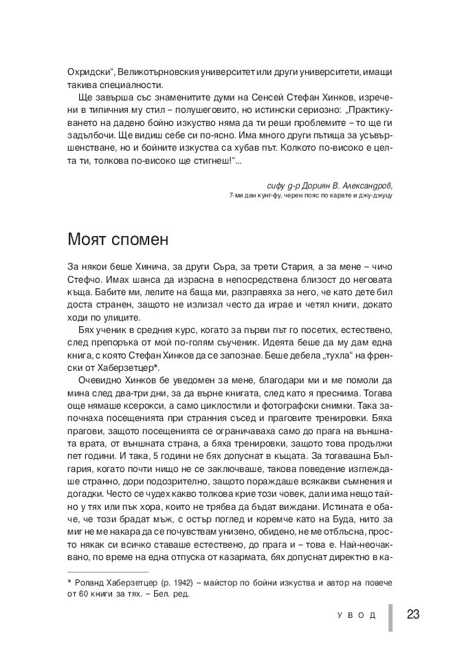 Д-р Добромир П. Друмев е събрал и записал не просто разговорите си със Сенсей Стефан Хинков, а е проследил създаването, налагането и разпространението, изпъстрено с многобройни перипетии и трудности, на източните бойни изкуства у нас легално и нелегално. Тяхната философия и практика навлизат с немногобройните и просъществували за кратко или по-дълго школи у нас, с българските треньори (майстори) и канените чуждестранни учители, с преведените за собствена употреба текстове за бойни изкуства.