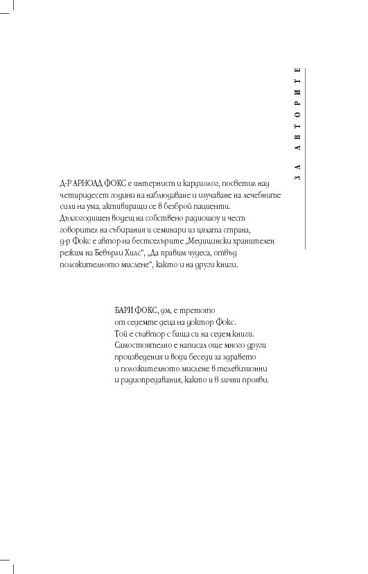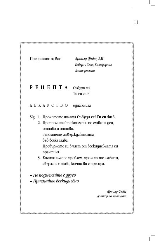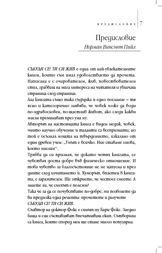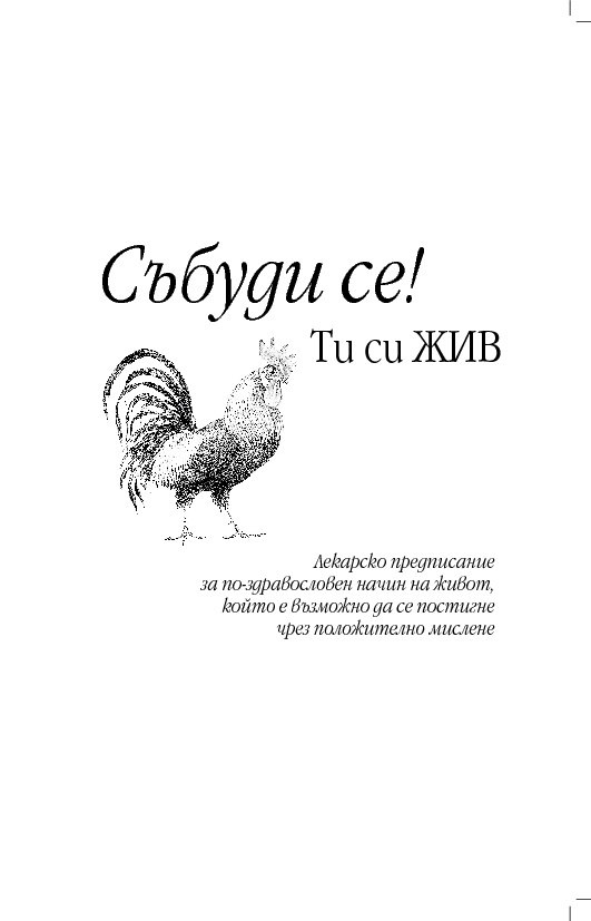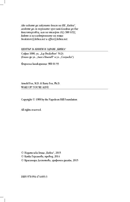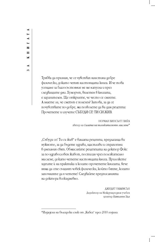 „Събуди се! Ти си жив“ е вашата рецепта, предлагаща ви нужното, за да бъдете здрави, щастливи и да се чувствате чудесно в днешния свят. Обмисляйте рецептата на доктор Фокс за по-здравословен живот, постиган чрез положително мислене, докато четете настоящата книга. Приложете идеите й на практика и когато прочетете книгата, физически вече няма да сте същият човек, който бяхте, когато започнахте да я четете! Следвайте предписанията на доктора всекидневно.