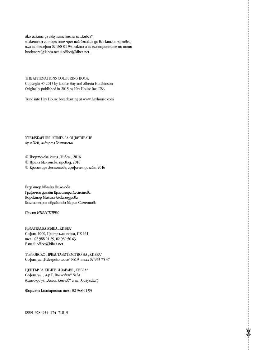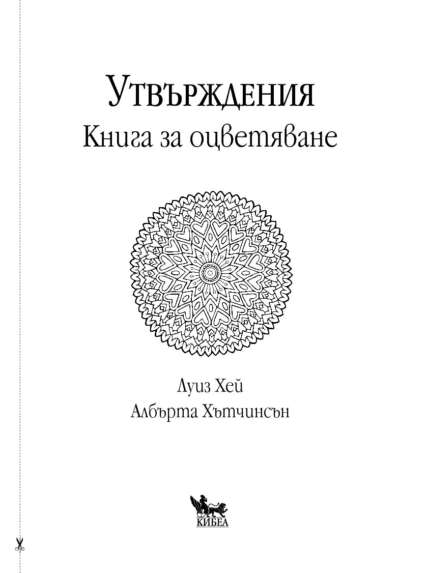 Много съм развълнувана от съвместния ни труд с Албърта Хътчинсън. От дете обичам книжките за оцветяване. Съчетанието между прекрасните утвърждения, които аз използвам всеки ден, и красивите рисунки на Албърта ми донесе огромно удоволствие. Казано най-просто, утвърждение е всяко нещо, което мислим или изричаме. Много от нещата, които хората обикновено мислят и говорят обаче, са доста негативни и не водят до положителни преживявания. Ако искаме да изцелим живота си, трябва да променим модела и да се приучим да мислим и говорим положително.
