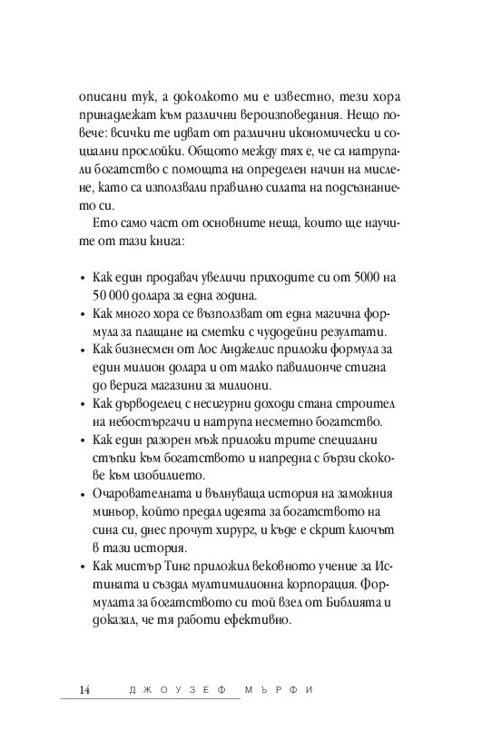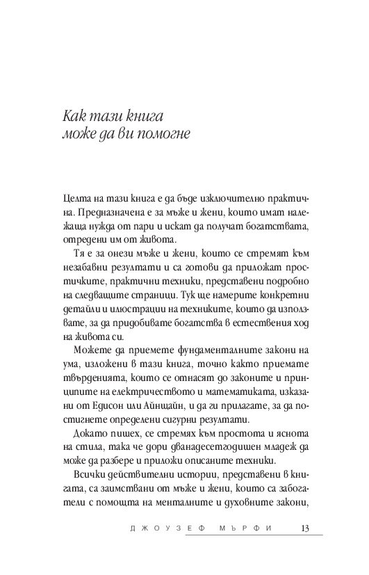 Независимо дали се борите да свържете двата края, или се опитвате да умножите състоянието си, утвърденият подход на д-р Джоузеф Мърфи ще ви покаже колко лесно е да упражнявате пълен контрол над финансовия си успех. Той ви разкрива поредица от прости, ежедневни стъпки, чрез които ще научите: