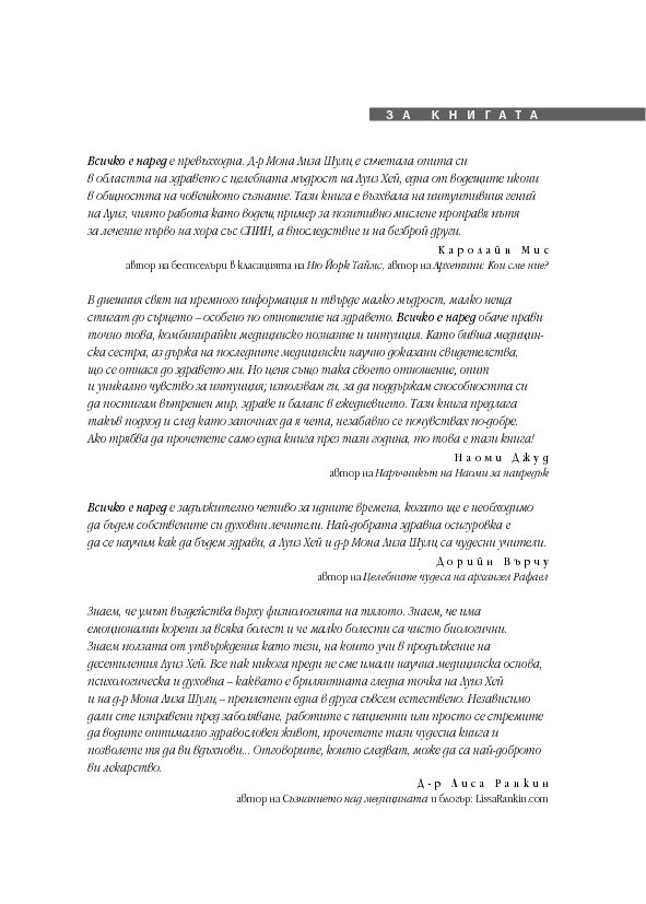 Във „Всичко е наред“ Мона Лиза Шулц, лекар и интуитивен лечител, заедно с Луиз Хей, изследват практиката на утвържденията и ви показват как да: