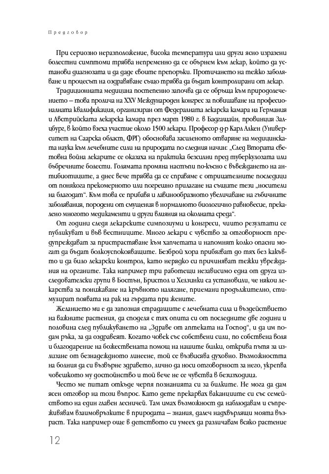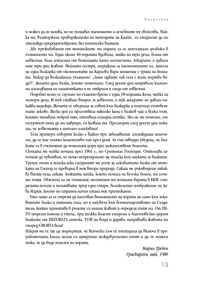 Тъй като днес, за жалост, се отдалечаваме все повече от природосъобразния начин на живот и все повече болести са предизвикани от погрешна житейска нагласа, преоткриването на „аптеката на Господ“ отговаря на една всеобща потребност. С това ново издание по-възрастните ще си припомнят съветите на Мария Требен, а по-младите ще ги открият за себе си и за своите деца. Винаги е добре да имаш мъдър събеседник, който не само дава знание, но вдъхва и най-ценното – надежда.